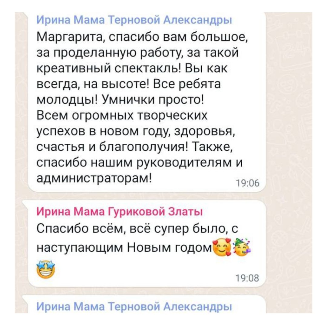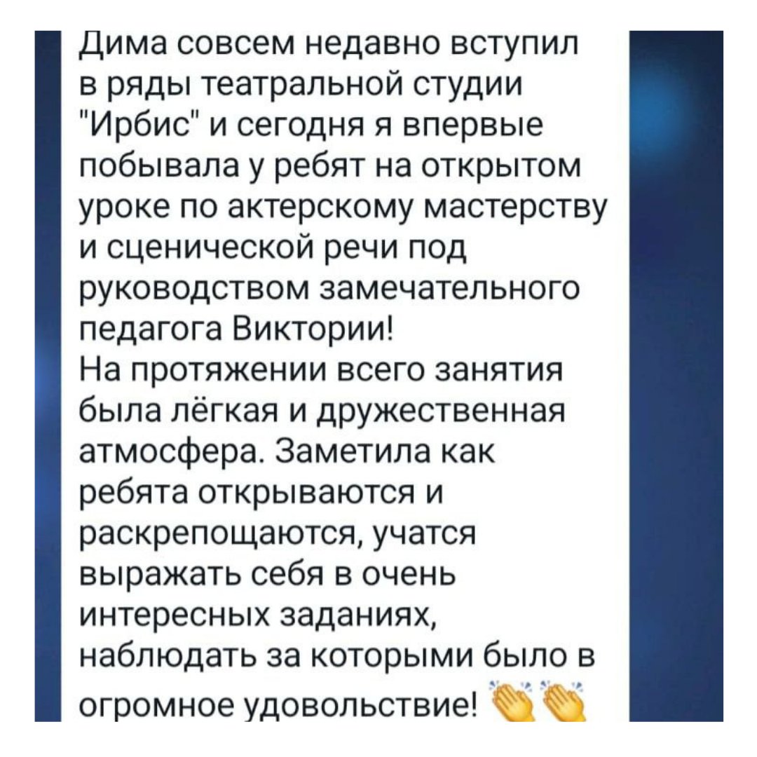 Абсолютно каждый наш ученик обогатится культурно, ведь мы регулярно ходим на спектакли, мастер-классы, а также устраиваем собственные культурные мероприятия, включая детские театральные сборы
